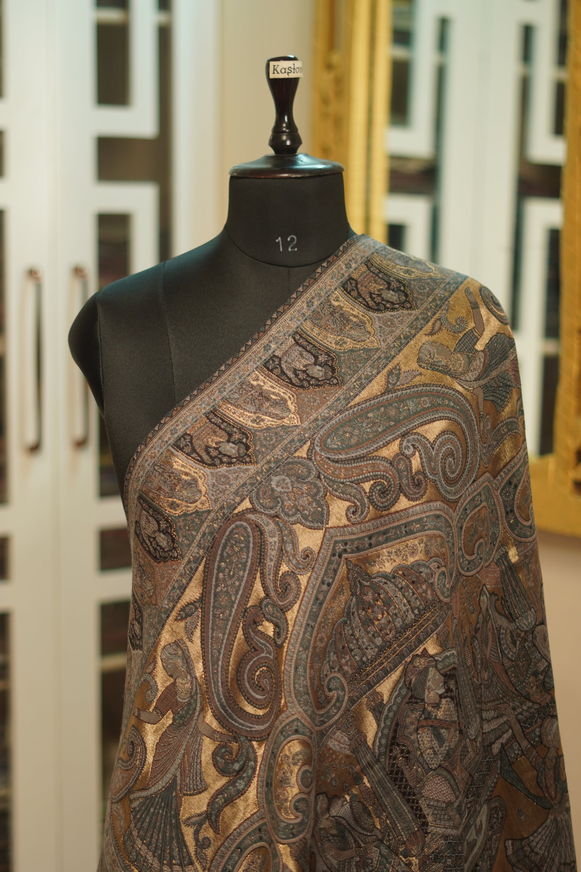 ✨ A graceful and beautifully woven Kani shawl inspired by soft moonlit tones and classic Kashmir weaving