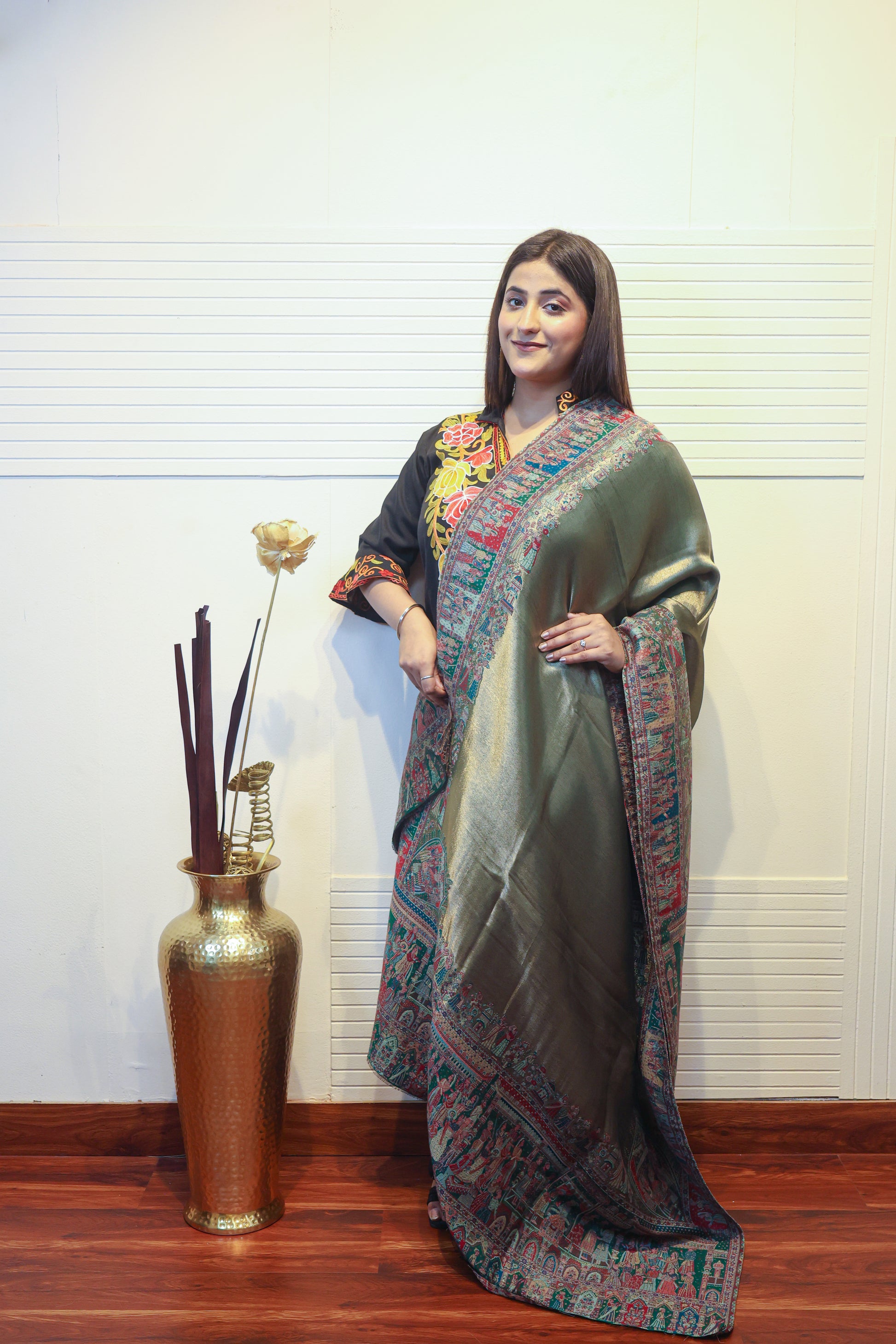 Its rich drape and luxurious feel make it a statement of sophistication—whether wrapped around evening elegance or layered with contemporary flair. Like a darbar gathering under the stars, it’s made to be admired, felt, and remembered.