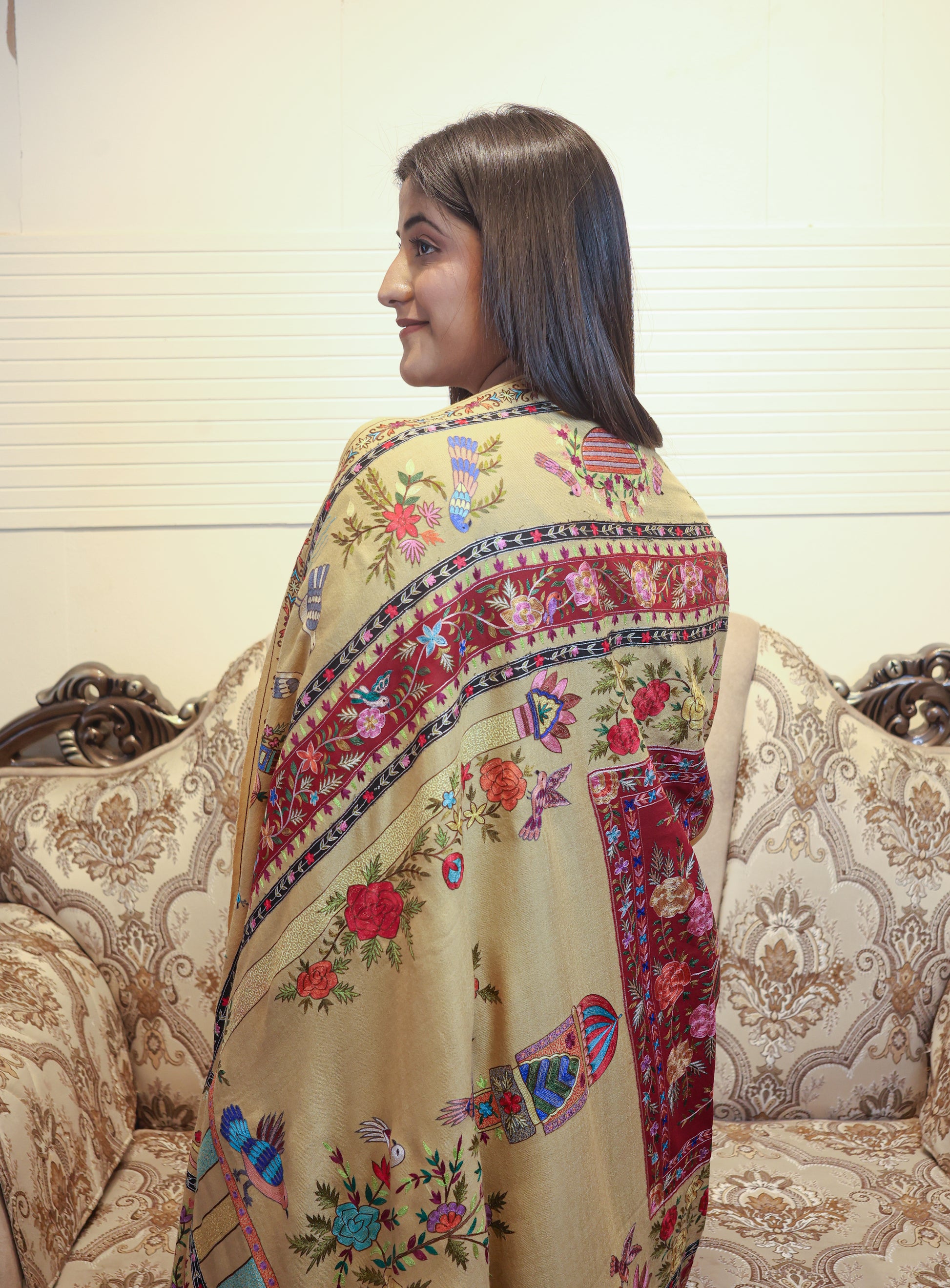 Set against the softness of genuine Kashmiri pashmina, these intricate designs transform every piece into a canvas of heritage. Lightweight yet luxuriously warm, it flows gracefully around you—perfect for heirloom occasions, festive soirées, or quiet moments of indulgence.